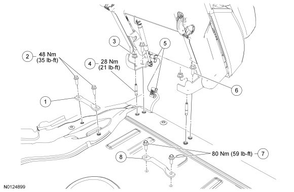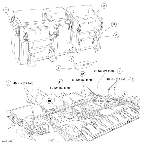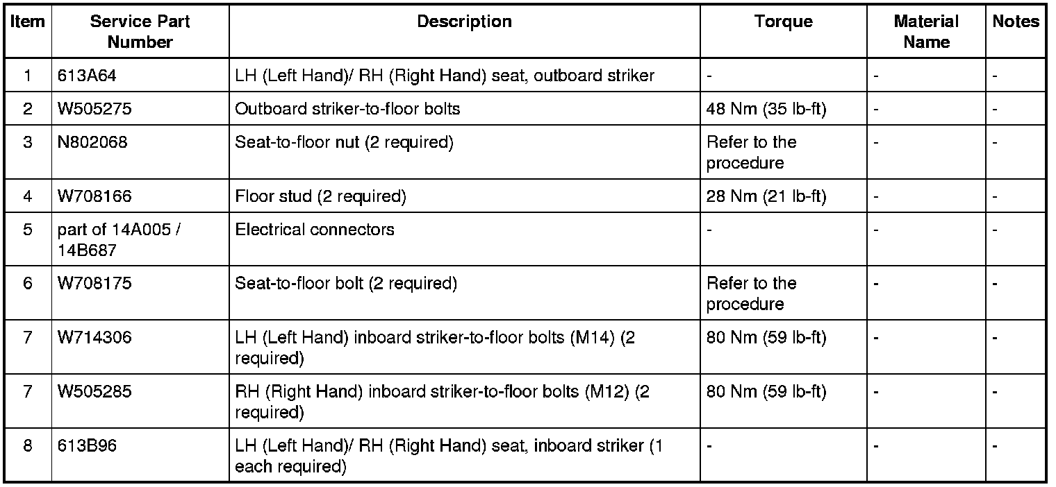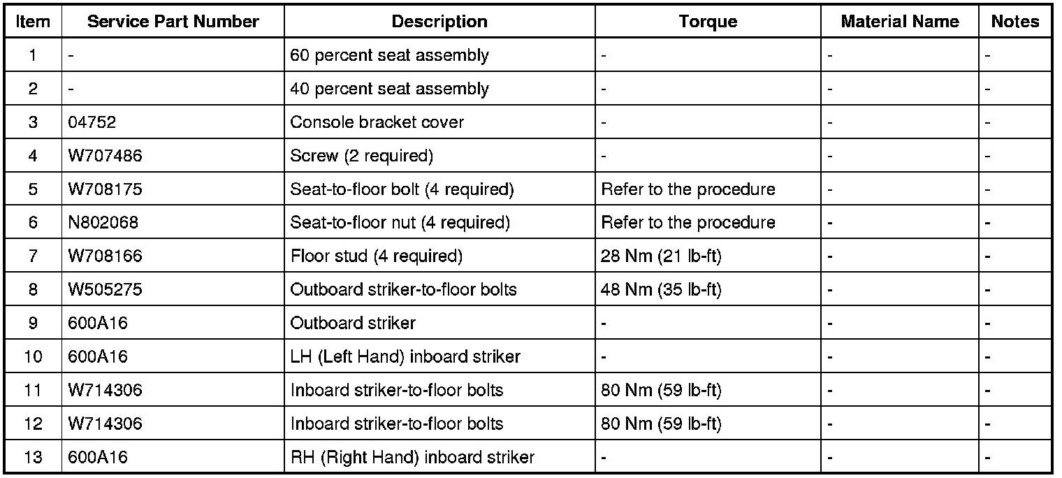 5. Remove the 2 seat-to-floor bolts and 2 seat-to-floor nuts for the affected seat.