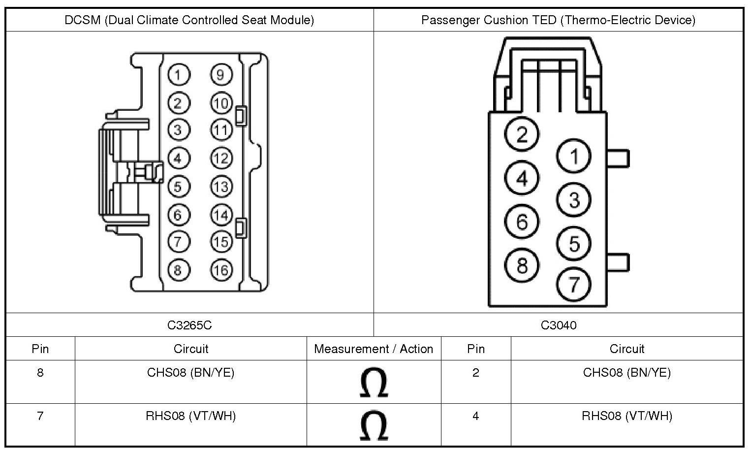 NOTICE: When taking measurements at DCSM (Dual Climate Controlled Seat Module) harness connectors, do not insert the electrical probes into the female connector pins. Inserting the probes into connector pins can cause intermittent or open electrical connections after reassembly resulting in DTCs (Diagnostic Trouble Codes) and system failure. Touching the tip of these connector pins is recommended instead.