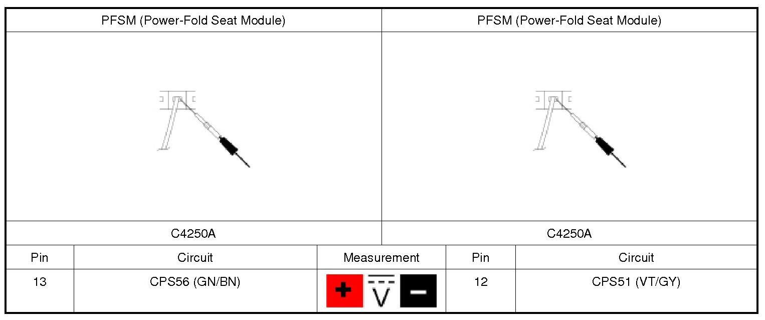 2. CHECK THE PFSM (Power-Fold Seat Module) FOR OUTPUT VOLTAGE TO THE LH (Left Hand) SEAT LATCH MOTOR