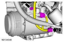 7. Disconnect the 2 A/C compressor electrical connectors.