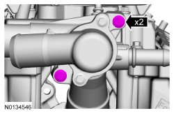 20. Remove the 2 thermostat housing-to-lower intake manifold bolts.