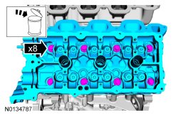 26. NOTICE: Place clean shop towels over exposed engine cavities. Carefully remove the towels so foreign material is not dropped into the engine. Any foreign material (including any material created while cleaning gasket surfaces) that enters the oil passages or the oil pan, may cause engine failure.