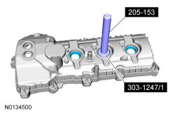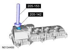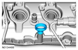 5. Ensure the VCT (Variable Camshaft Timing) seals in the valve cover are below the top of the connector (flat portion) on the VCT (Variable Camshaft Timing) oil control valve otherwise the interface may leak.