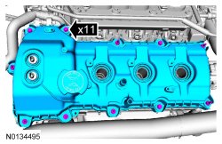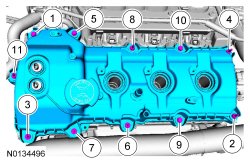 NOTE: If the valve cover is not installed and the fasteners tightened within 4 minutes, the sealant must be removed and the sealing area cleaned. To clean the sealing area, use Motorcraft(R) Silicone Gasket Remover and Motorcraft(R) Metal Surface Prep. Failure to follow this procedure can cause future oil leakage.