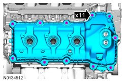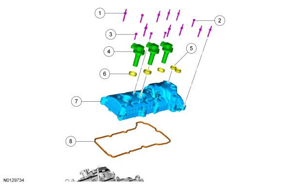 NOTE: If the valve cover is not installed and the fasteners tightened within 4 minutes, the sealant must be removed and the sealing area cleaned. To clean the sealing area, use Motorcraft(R) Silicone Gasket Remover and Motorcraft(R) Metal Surface Prep. Failure to follow this procedure can cause future oil leakage.