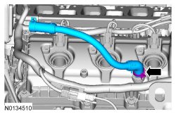 5. Ensure the VCT (Variable Camshaft Timing) seals in the valve cover are below the top of the connector (flat portion) on the VCT (Variable Camshaft Timing) oil control valve otherwise the interface may leak.