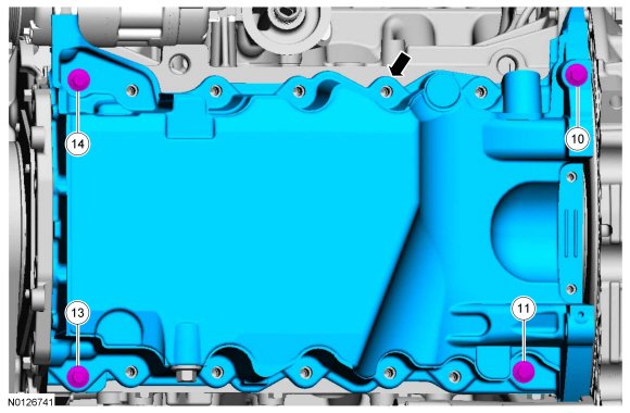 Install the oil pan and bolts 10, 11, 13 and 14 finger tight.