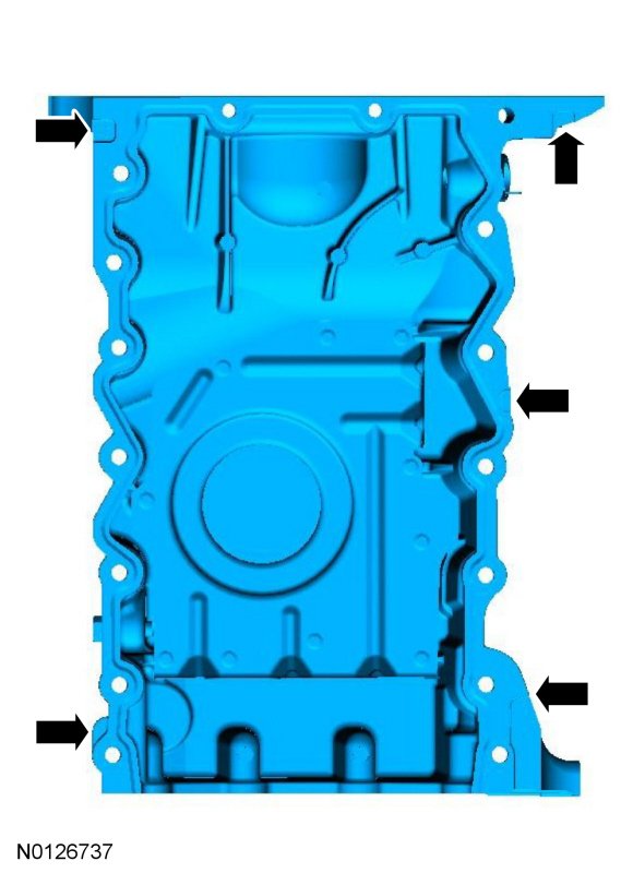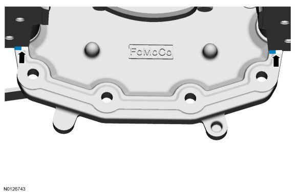1. Apply a 5.5 mm (0.22 in) bead of Motorcraft(R) High Performance Engine RTV Silicone to the 2 engine front cover-to-cylinder block joint areas on the sealing surface of the oil pan.
