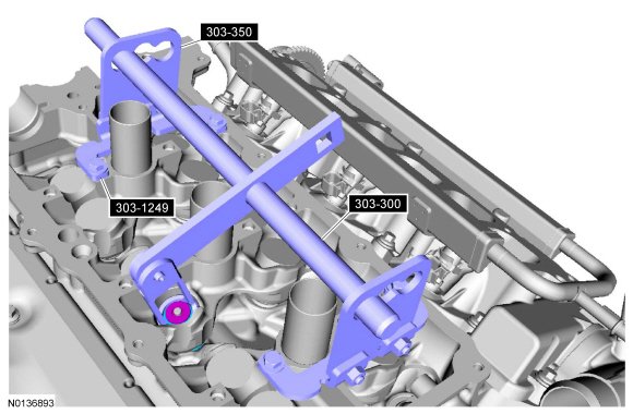 2. Using 303-300 (T87C-6565-A) , 303-350 (T89P-6565-A) and 303-1249 , install the valve spring, retainer and key.