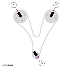 16. Install the 2 new LH (Left Hand) VCT (Variable Camshaft Timing) bolts and tighten in 4 stages: