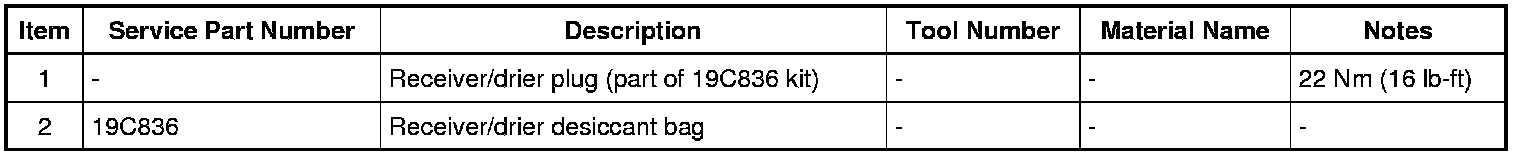 1. Installation of a new receiver/drier desiccant bag is not required when repairing the A/C system, except when there is physical evidence of contamination from a failed A/C compressor or damage to the receiver/drier desiccant bag. Damage to the receiver/drier desiccant bag includes physical damage to the receiver/drier desiccant bag or moisture contamination. Moisture contamination results only from a complete loss of refrigerant and equalization of the refrigerant system pressure with atmospheric pressure for a period longer than one hour. If even a slight amount of positive refrigerant pressure is present in the system before repairs are carried out, the receiver/drier desiccant bag should not be replaced.
