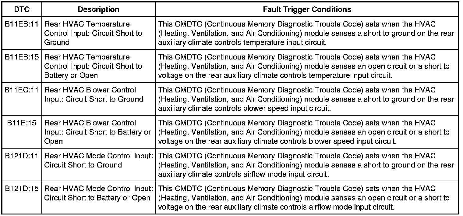 Under normal operation, the rear auxiliary control is supplied a 5-volt reference and ground from the HVAC (Heating, Ventilation, and Air Conditioning) module. When the auxiliary blower motor speed, airflow mode or temperature control is adjusted, the HVAC (Heating, Ventilation, and Air Conditioning) module reads the voltage from the rear auxiliary climate controls on the auxiliary blower motor speed, airflow mode and temperature control feedback circuits to determine the requested setting.