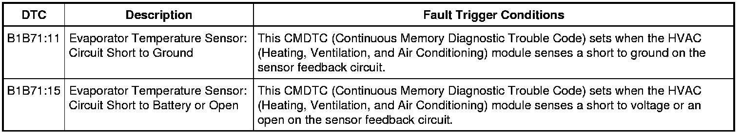 The evaporator discharge air temperature sensor is used for A/C (Air Conditioning) compressor cycling. An accurate evaporator temperature is critical to prevent evaporator icing. The HVAC (Heating, Ventilation, and Air Conditioning) module uses the temperature measurement to turn off the A/C (Air Conditioning) compressor before the evaporator temperatures are cold enough to freeze the condensation. This prevents ice blockage of airflow over the evaporator core.