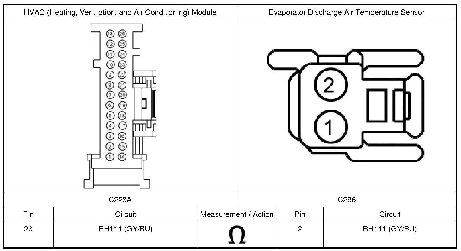 The evaporator discharge air temperature sensor receives a ground from the HVAC (Heating, Ventilation, and Air Conditioning) module. The sensor varies its resistance with the temperature. As the temperature rises, the resistance falls. As the temperature falls, the resistance rises. The HVAC (Heating, Ventilation, and Air Conditioning) module measures this resistance to determine the temperature at the sensor.