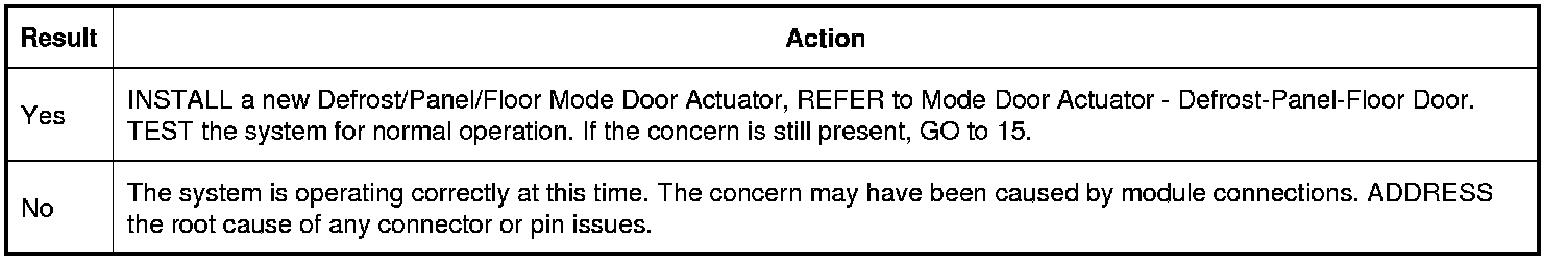 NOTE: Access to the defrost/panel/floor mode door actuator motor connector in this pinpoint test is difficult. Before disconnecting the defrost/panel/floor mode door actuator motor connector, visually inspect the actuator and its harness for obvious damage. If no damage is evident, proceed with the test.