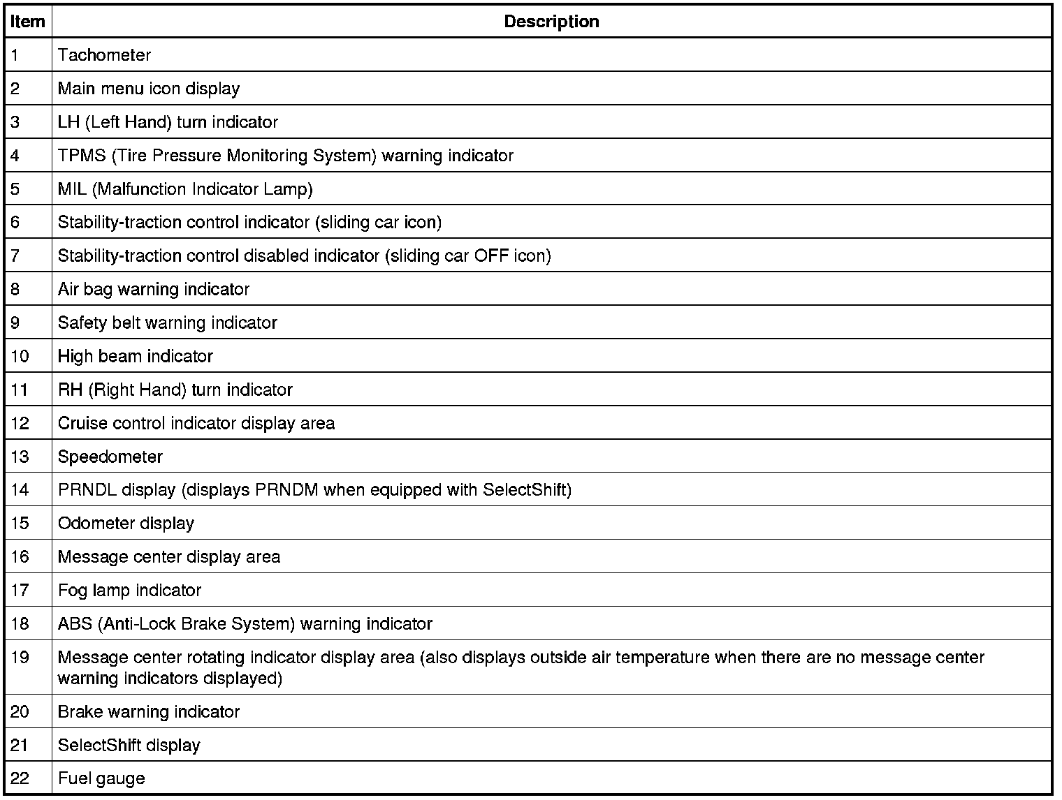 Informational indicators provide information to the driver of conditions that exist in the vehicle. Warning indicators provide information to the driver of conditions that could potentially cause personal injury or alter vehicle performance.