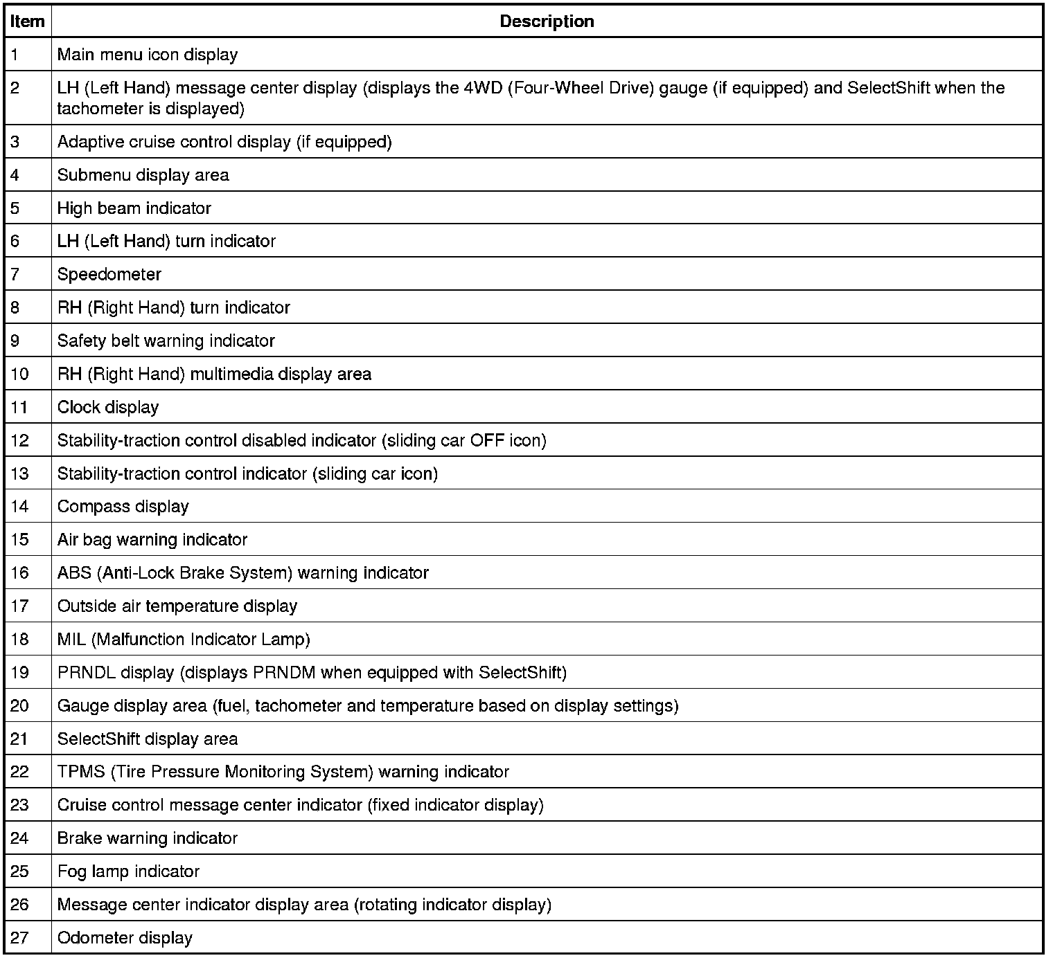 The base IPC (Instrument Panel Cluster) is available with a single LCD (Liquid Crystal Display) screen. The optional IPC (Instrument Panel Cluster) is available with dual RH (Right Hand) and LH (Left Hand) LCD (Liquid Crystal Display) screens. The single display screen and the LH (Left Hand) display screen contain the conventional message center information. The RH (Right Hand) display screen displays multimedia information (audio, phone, navigation and climate control) as well as items such as vehicle direction, outside air temperature and time. REFER to Information and Entertainment Systems - Premium Plus , REFER to Information and Entertainment Systems - Sony Sound , REFER to Climate Control - DATC or REFER to Climate Control - EMTC for information on the RH display screen.