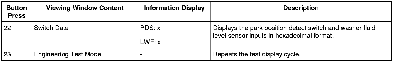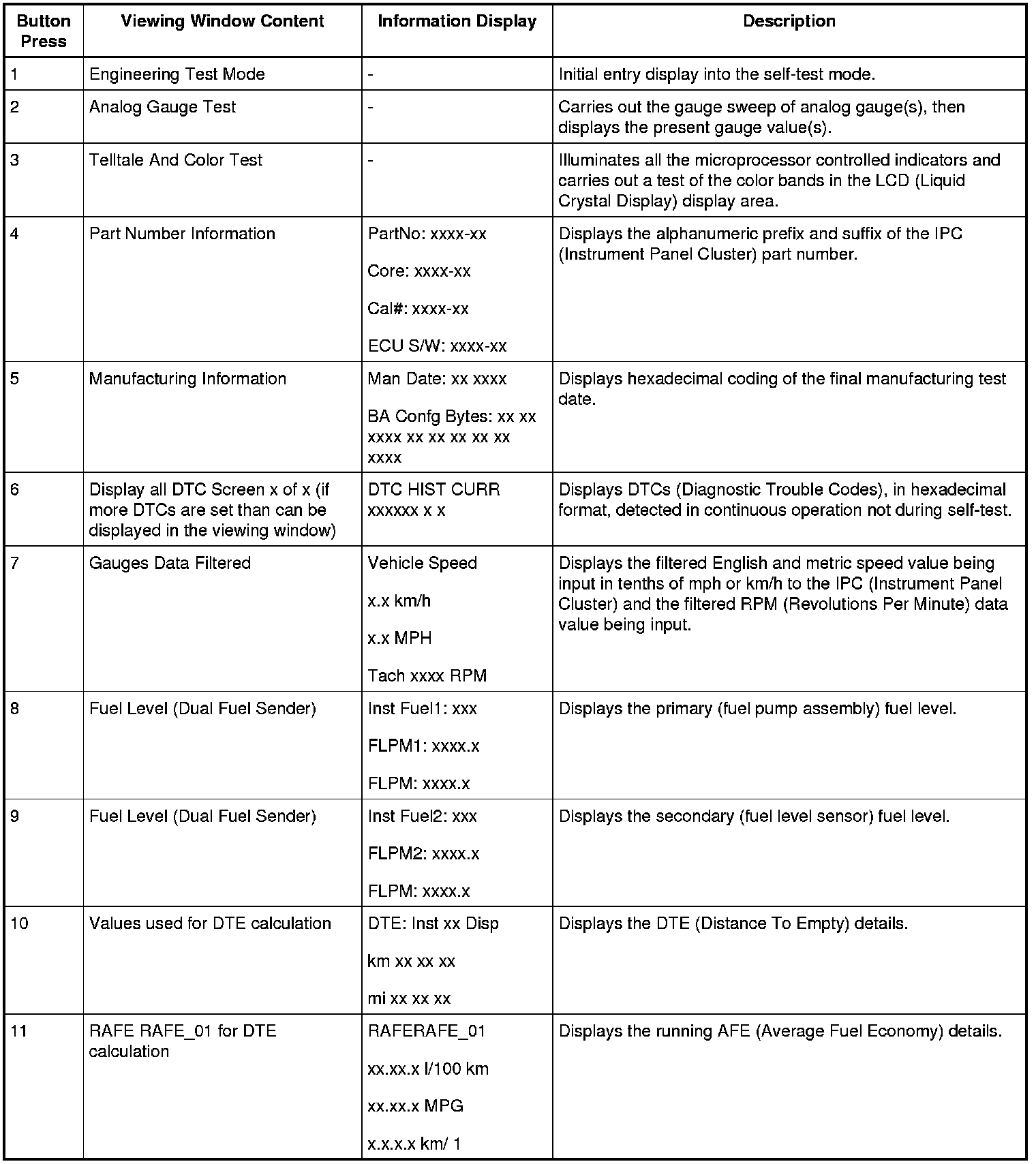 To enter the IPC (Instrument Panel Cluster) self-diagnostic mode, begin with the ignition in the OFF mode. Press and hold the RH (Right Hand) steering wheel switch OK button (optional IPC (Instrument Panel Cluster)) or the LH (Left Hand) steering wheel switch OK button (base IPC (Instrument Panel Cluster)). Place the ignition in the ON mode and hold the button until the display indicates ENGINEERING TEST MODE, usually within 3 to 5 seconds. Press the up or down arrow buttons to navigate through each of the display windows. To exit the IPC (Instrument Panel Cluster) self-test mode, press and hold the OK button for 3-5 seconds or place the ignition in the OFF mode. The dealer test mode displays multiple items in a viewing window on the RH (Right Hand) side of the IPC (Instrument Panel Cluster). Each button press advances the viewing window to the next set of items.