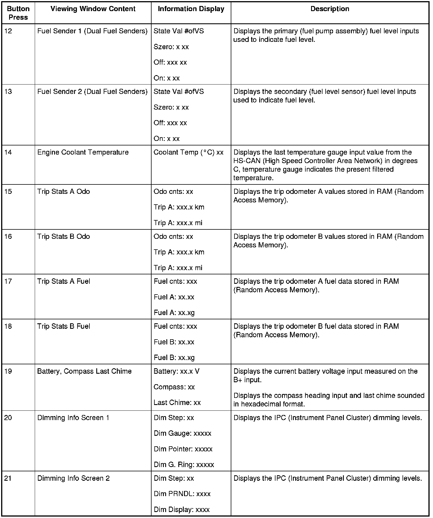 NOTE:Some of the displays listed in the table below use xxx's to represent a numeric or alphanumeric value. The value may display the same amount of characters represented by the xxx's or there may be more/less depending on the type of display. For example: DTC HIST CURR xxxxxx x x may display DTC HIST CURR C10000 X. Note that there were 8 x's in the display description but only 7 digits in the actual display.