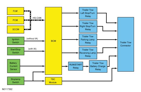 The BJB (Battery Junction Box) supplies voltage at all times to the trailer tow stop/turn lamp relays. The BCM (Body Control Module) provides voltage to the trailer tow stop/turn lamp relay coils to correspond with the rear stop/turn lamp functions of the vehicle.