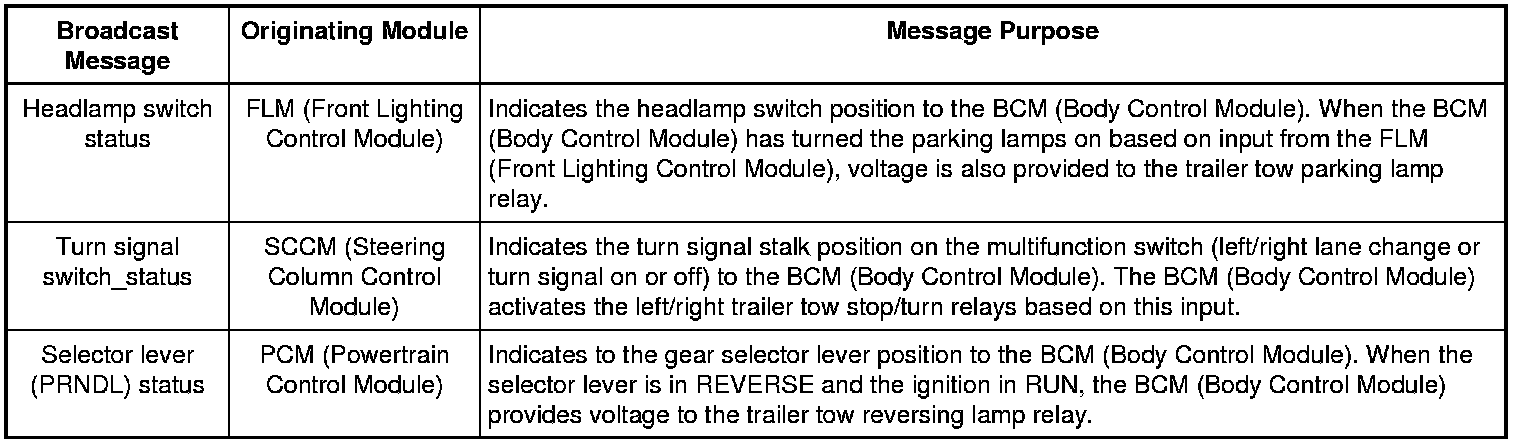 The BJB (Battery Junction Box) supplies voltage at all times to the trailer tow parking lamp relay. The vehicle rear parking lamp output circuit from the BCM (Body Control Module) is spliced to provide voltage to the trailer tow parking lamp relay coil to correspond with the parking lamp function of the vehicle.