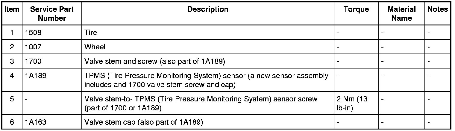 - Tighten the new valve stem-to- TPMS (Tire Pressure Monitoring System) sensor screw to 2 Nm (13 lb-in).
