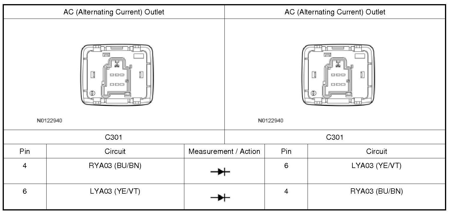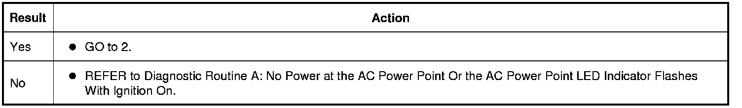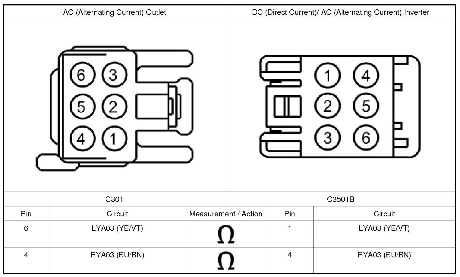 The DC (Direct Current)- AC (Alternating Current) inverter receives 12 volts DC (Direct Current) from the BJB (Battery Junction Box) and the BCM (Body Control Module) and is wired to chassis ground. The incoming DC (Direct Current) is internally converted to 60 Hz 110 volts AC (Alternating Current) that is outputted to the AC (Alternating Current) outlet. If a fault in the system is detected, the LED (Light-emitting Diode) flashes when the ignition is ON. The LED (Light-emitting Diode) is continuously illuminated if the system is operating correctly when the ignition is ON. The DC (Direct Current)- AC (Alternating Current) inverter supplies 12 volts DC (Direct Current) and ground to the LED (Light-emitting Diode) along two circuits.