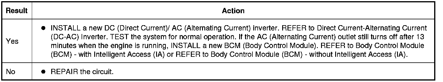 The DC (Direct Current)/ AC (Alternating Current) inverter receives a signal from the BCM (Body Control Module) over the LIN (Local Interconnect Network) whenever the engine is running. If the DC (Direct Current)/ AC (Alternating Current) inverter does not receive this message for 13 minutes, the inverter stops supplying 110 volts to the power outlet and the green LED (Light-emitting Diode) indicator flashes. The system can be reset by cycling the ignition from ON to OFF and back to ON, however the system only operates for another 13 minutes unless the signal is received from the BCM (Body Control Module) that the engine is running.