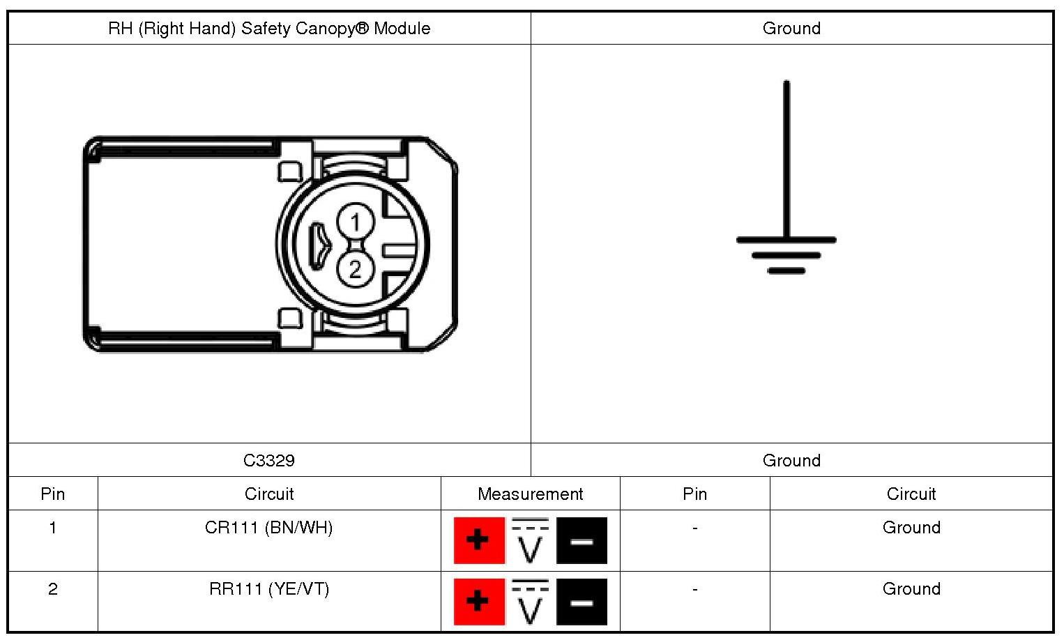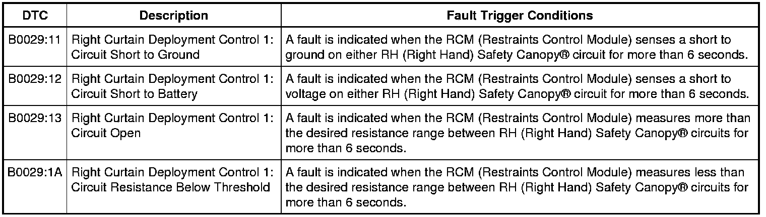 The RCM (Restraints Control Module) continuously monitors the RH (Right Hand) Safety Canopy(R) module circuits for the following faults: