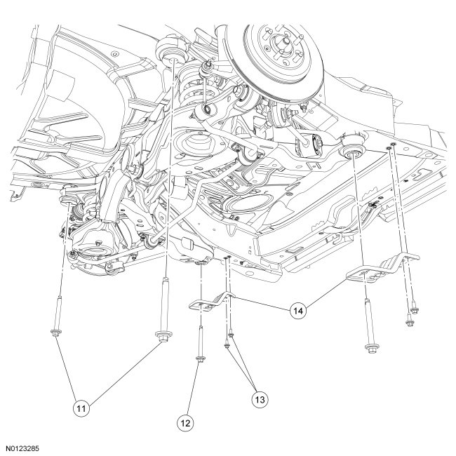 13. Remove and discard the upper arm-to-subframe forward bolt and nut.