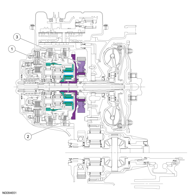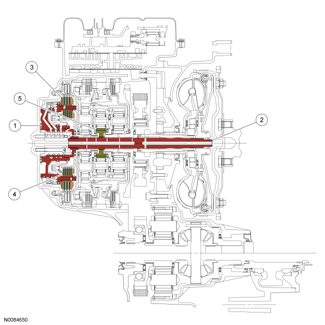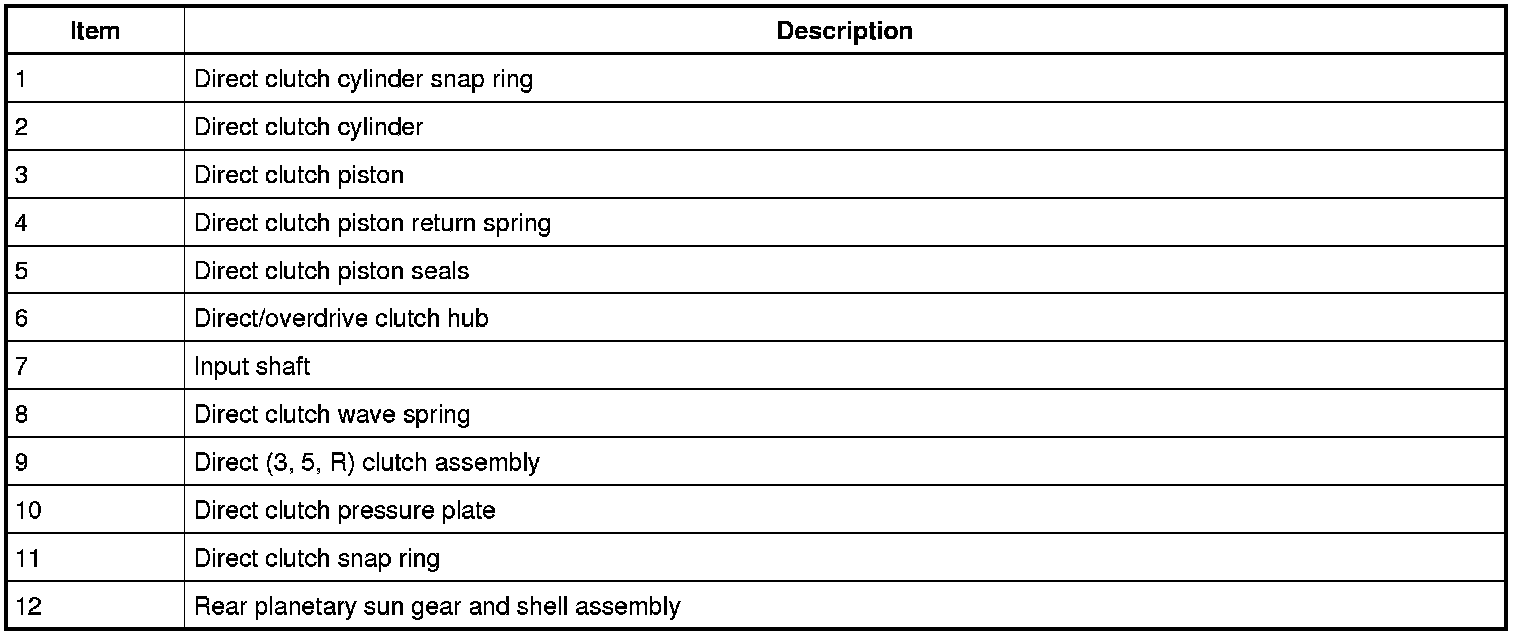 The direct clutch is a drive clutch that transfers power from the direct/overdrive clutch hub assembly to the rear planetary sun gear and shell assembly. The direct clutch is applied in 3rd and 5th gears and reverse.