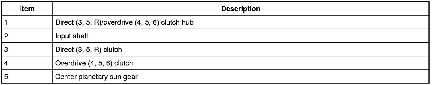 The input shaft is part of the direct/overdrive clutch assembly and is splined to the torque converter turbine and the center planetary sun gear. The input shaft transfers power from the torque converter to the rear planetary gearset through the center planetary sun gear and the direct (3, 5, R) and overdrive (4, 5, 6) clutches.