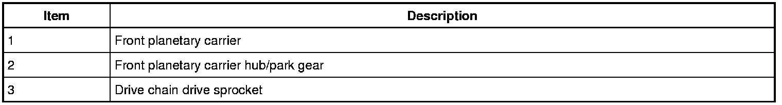 The front planetary carrier is splined to the rear planetary ring gear and transfers power from the rear planetary gearset to the front planetary gearset in 2nd, 3rd, 5th and 6th gears and reverse. The front planetary carrier is splined to the drive chain sprocket. The front planetary carrier is the output component for the planetary gearset.