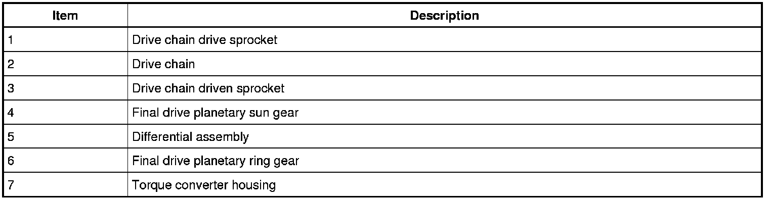 The final drive consists of a drive chain and sprockets and a planetary gearset and differential assembly. The drive chain and sprockets transfer torque from the front planetary carrier hub to the differential assembly that has a planetary gearset integrated into it for final drive torque multiplication.
