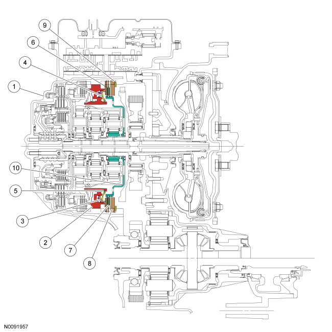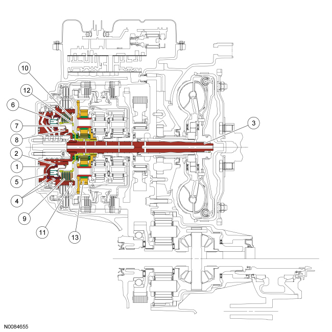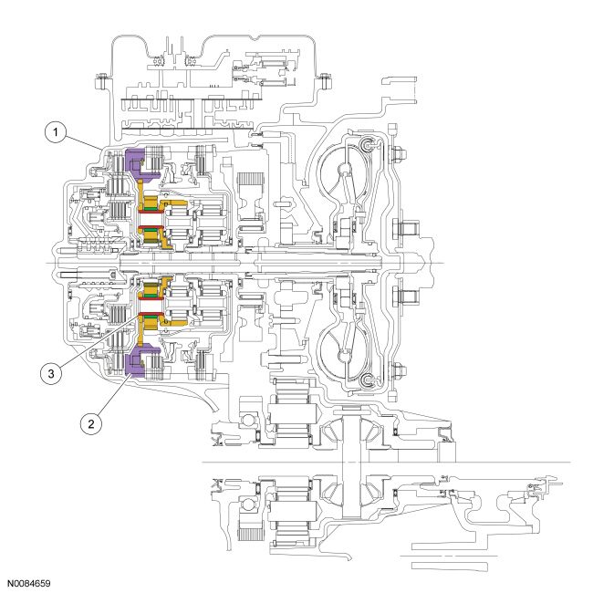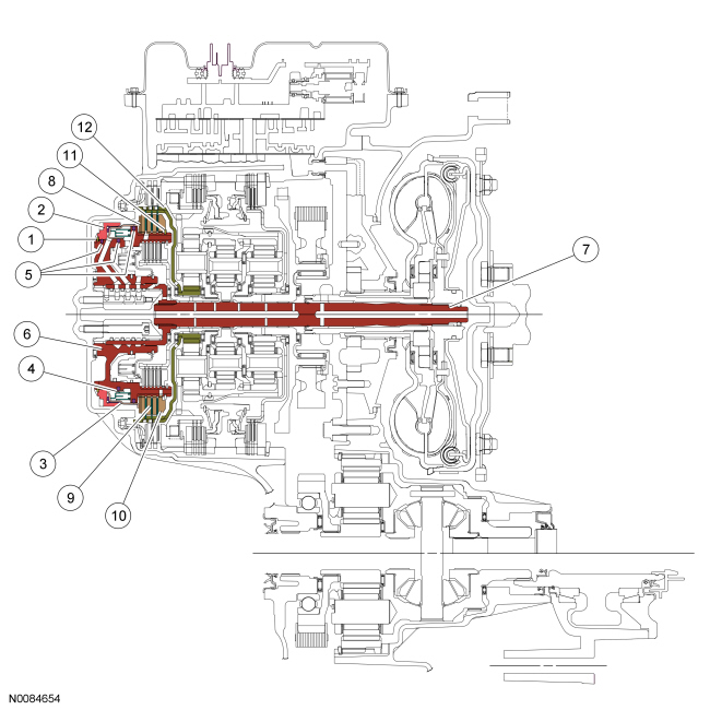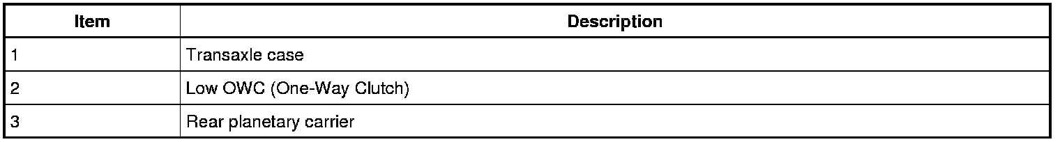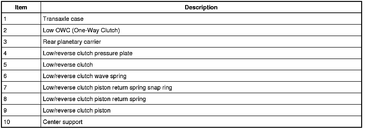 The low/reverse clutch is a brake clutch that holds the low OWC (One-Way Clutch) which is splined to the rear planetary carrier. The low/reverse clutch is applied in manual LOW, REVERSE and 1st gear up to 8 km/h (5 mph).