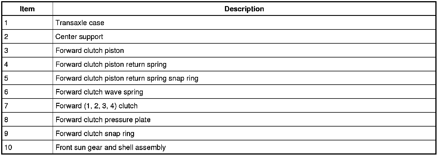 Hydraulic pressure from the regulator valve in the valve body pushes the forward clutch piston against the forward clutch pack to apply the clutch. The front sun gear and shell assembly is held stationary to the transaxle case as a result of the clutch being applied.