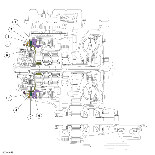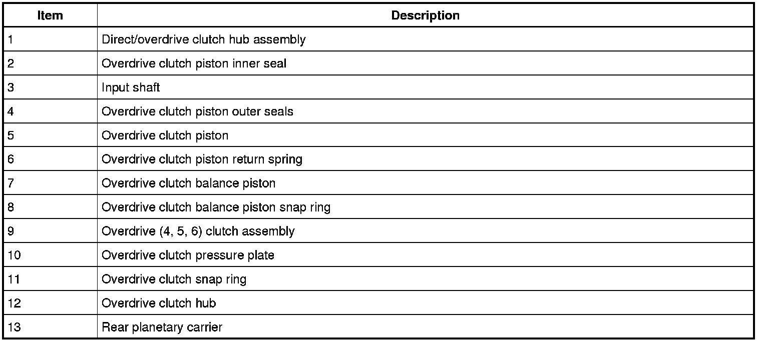 The overdrive clutch is a drive clutch that transfers power from the direct/overdrive clutch hub assembly to the rear planetary carrier. The overdrive clutch is applied in 4th, 5th and 6th gears.