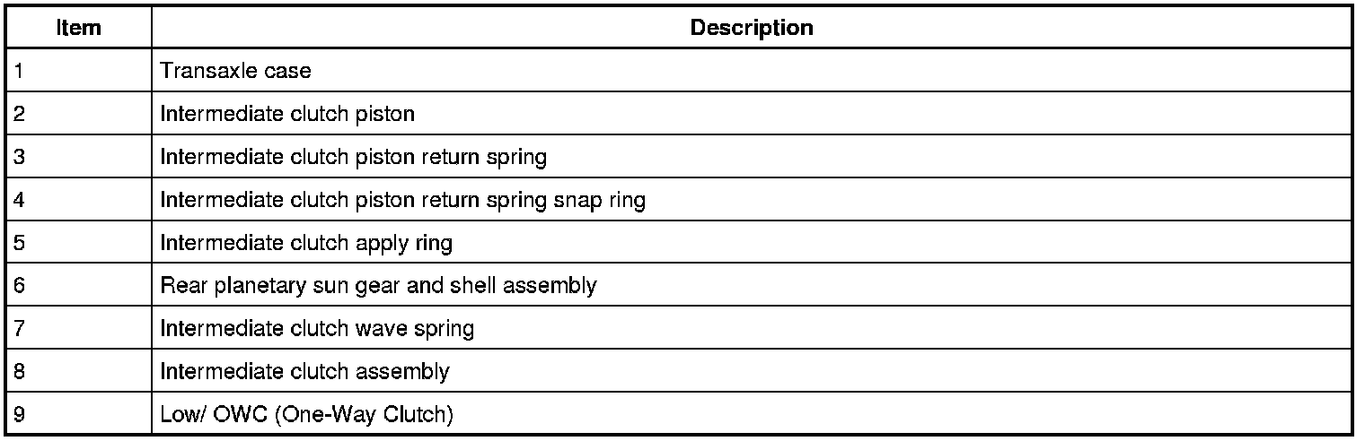 Hydraulic pressure from the regulator valve in the valve body pushes the intermediate clutch piston against the intermediate clutch pack to apply the clutch. The low OWC (One-Way Clutch) works as a pressure plate for the intermediate (2, 6) clutch. The rear planetary sun gear and shell assembly is held stationary to the transaxle case as a result of the clutch being applied.