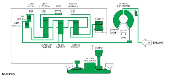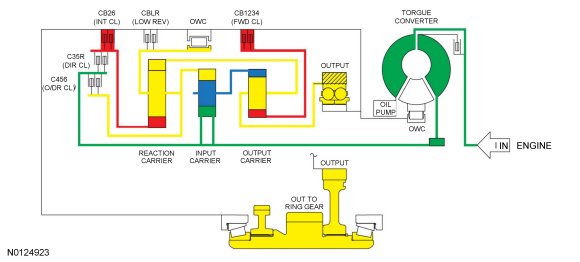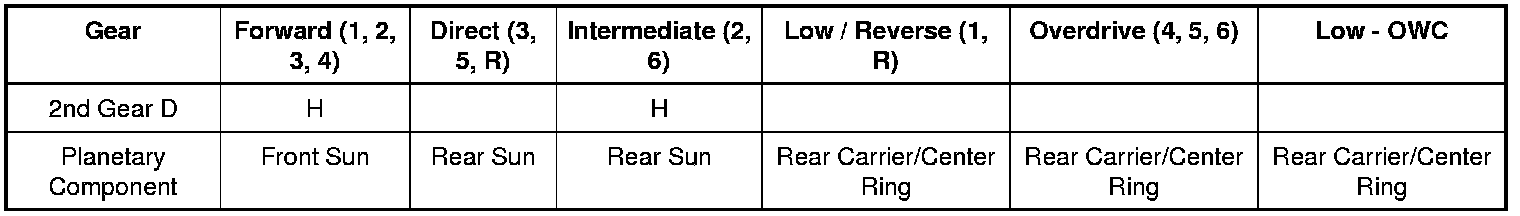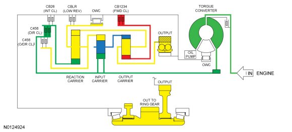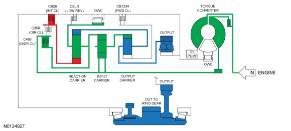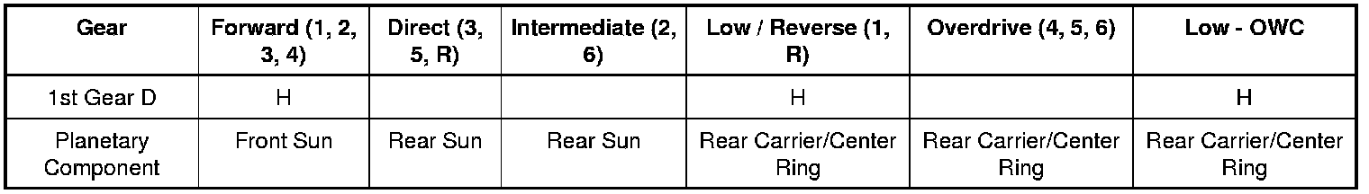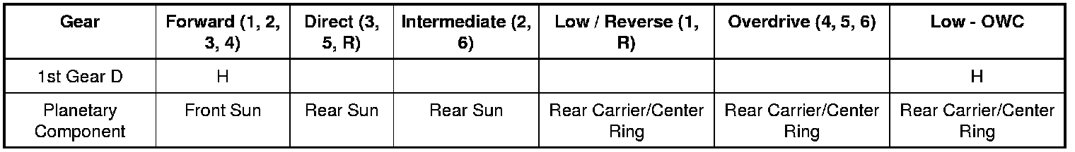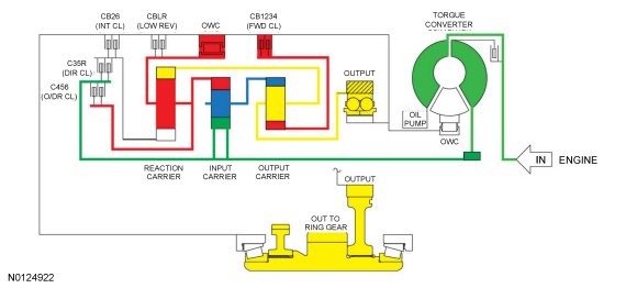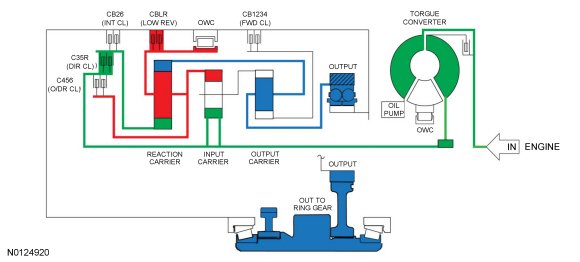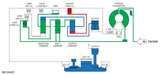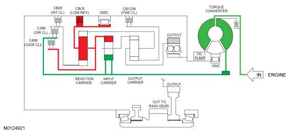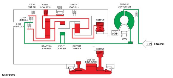- The rear planetary carrier/center ring gear is held stationary by the low OWC (One-Way Clutch) and / or the low reverse (1,R) clutch.
