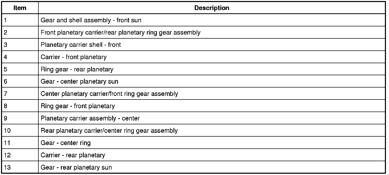The center planetary ring gear is splined to the rear planetary carrier. The center ring gear/rear planetary carrier is held stationary by the low OWC (One-Way Clutch) and low/ reverse clutch in 1st gear and reverse. The center ring gear/rear planetary carrier is driven by the overdrive (4, 5, 6) clutch in 4th, 5th, and 6th gears.