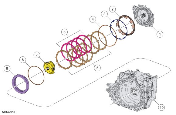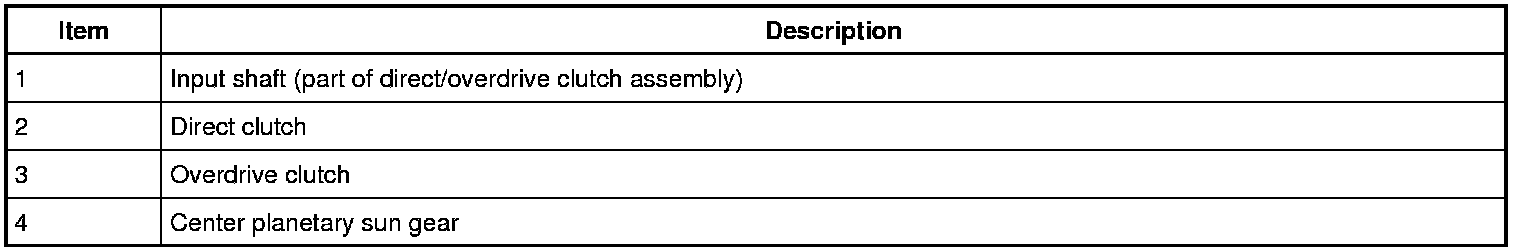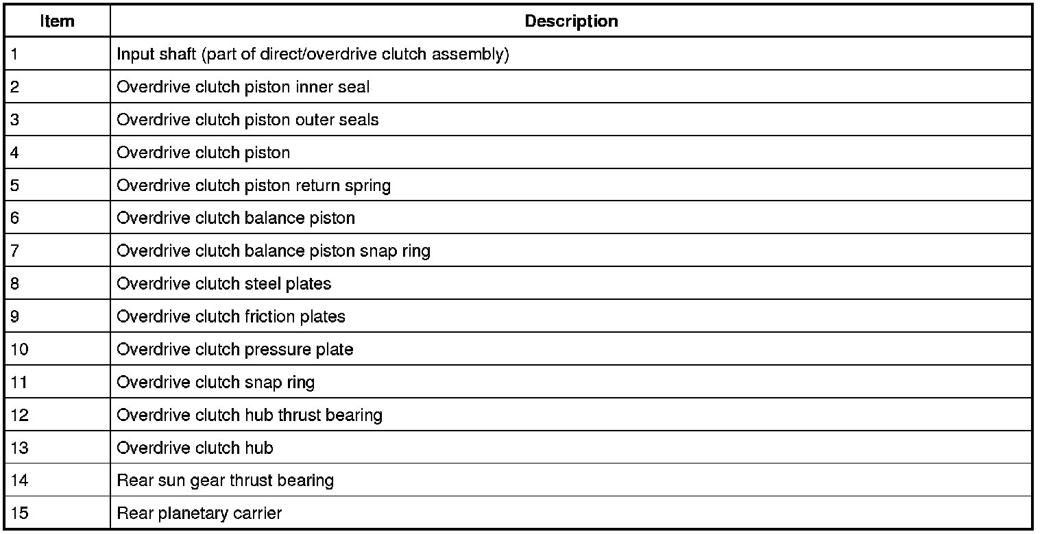 The overdrive clutch is a drive clutch that transfers power from the direct/overdrive hub and shaft assembly to the rear planetary carrier. The overdrive clutch is applied in 4th, 5th and 6th gear.