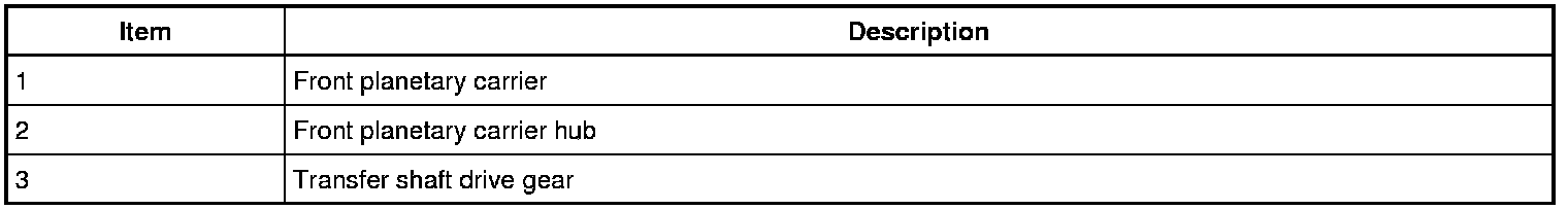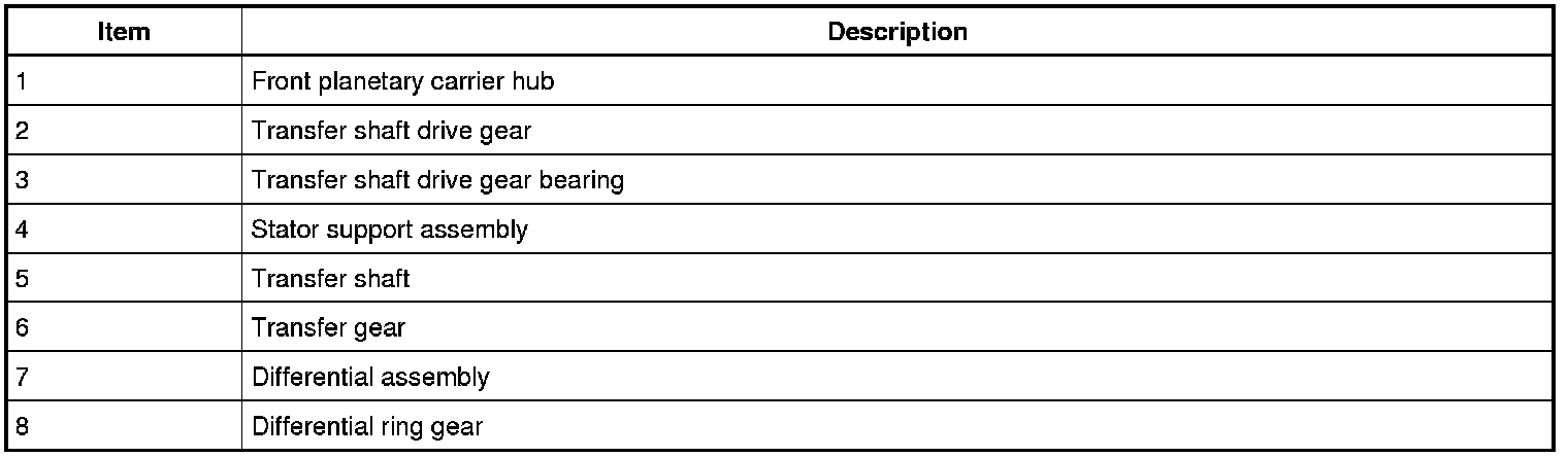 The planetary gear set transfers power to the transfer shaft drive gear through the front planetary carrier hub. The transfer shaft drive gear is part of the stator support assembly. The transfer shaft drive gear turns the transfer shaft and gear assembly which multiplies torque through gear reduction and turns the differential ring gear.