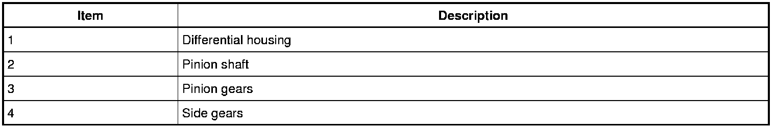 The differential allows the half shafts and wheels to rotate at different speeds during cornering and transfers power to the PTU (Power Transfer Unit) for AWD (All-Wheel Drive) vehicles. The differential assembly consists of the following components: