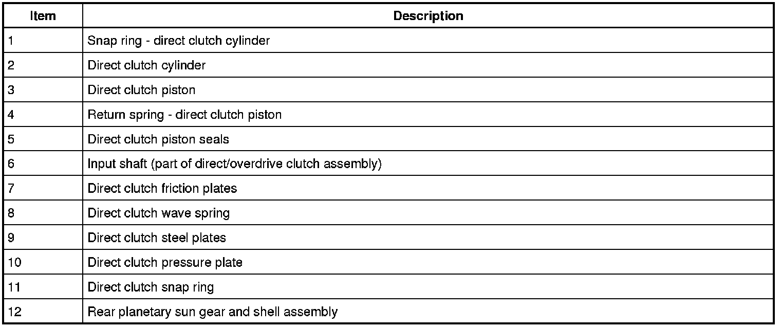 The direct clutch is a drive clutch that transfers power from the direct/overdrive hub and shaft assembly to the rear sun gear. The direct clutch is applied in 3rd and 5th gear and reverse.
