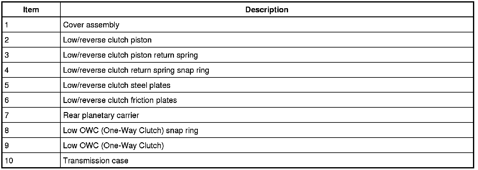 The low/reverse clutch is a brake clutch that holds the low OWC (One-Way Clutch) which is splined to the rear planetary carrier. The low/reverse clutch is applied in manual LOW, REVERSE and 1st gear up to 8 km/h (5 mph).