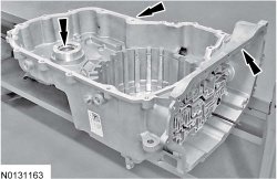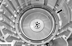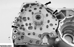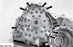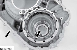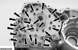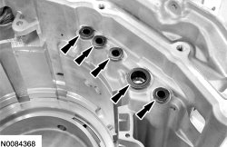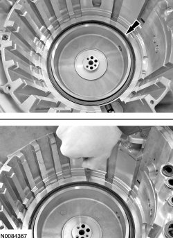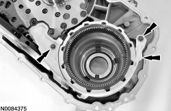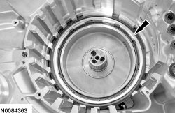 84. Clean and inspect the torque converter housing and the differential ring gear for damage or excessive wear. If the differential ring gear shows signs of excessive wear or damage replace the differential ring gear. REFER to Transmission Case . Clean the silicone from the torque converter housing-to-transmission case sealing surface.
