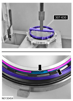 Using 307-630 and a press, compress the forward (1, 2, 3, 4) clutch return spring and remove the snap ring and the snap ring retainer.