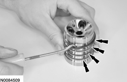 121. Apply 483 kPa (70 psi) of air pressure to the forward (1, 2, 3, 4) clutch piston port and remove the forward (1, 2, 3, 4) clutch piston.