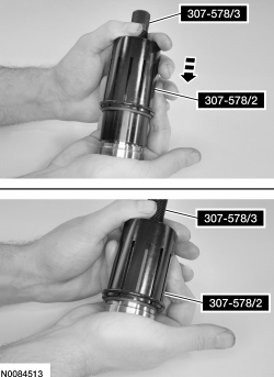 139. Install 307-578 /2 over 307-578 /3. Using 307-578 /2, slide the Teflon(R) seal over the clutch support tower and into the groove.