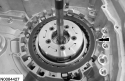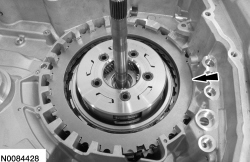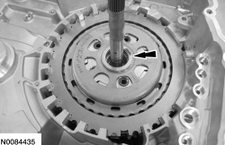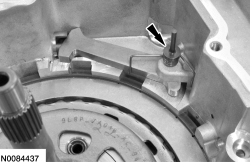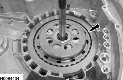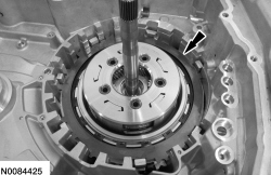 Install the forward (1, 2, 3, 4) clutch beveled snap ring with the flat side down with the gap facing the front of the transmission.